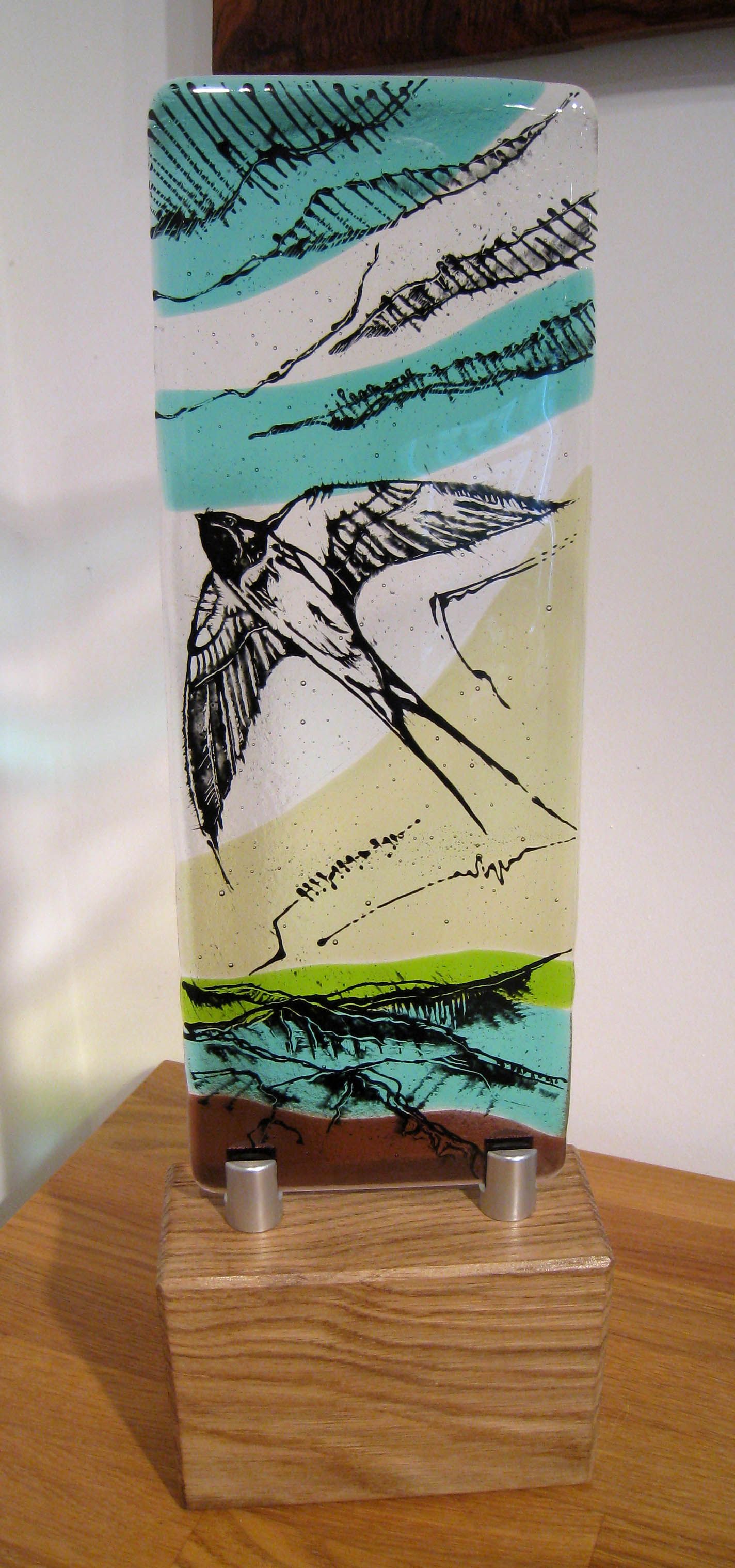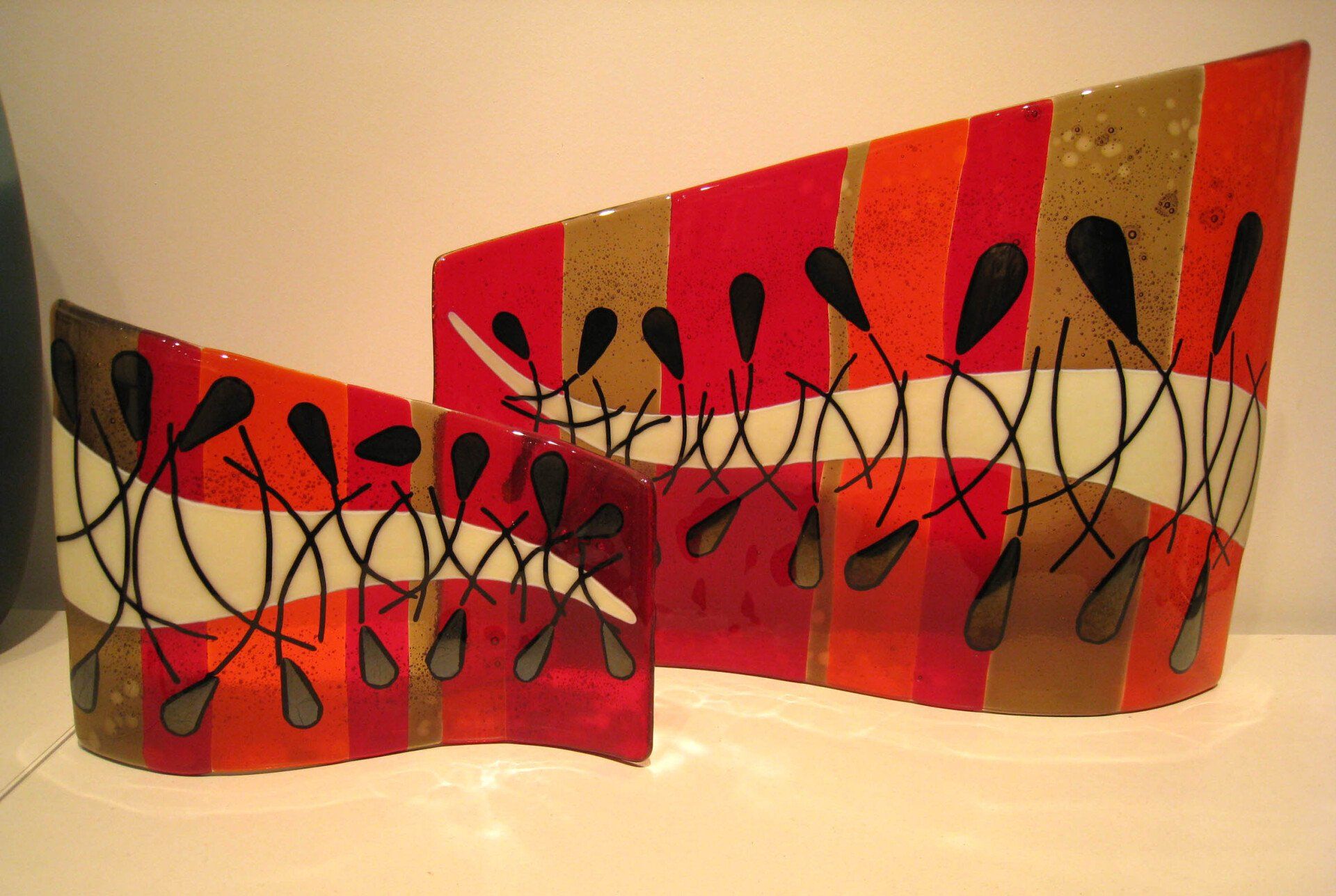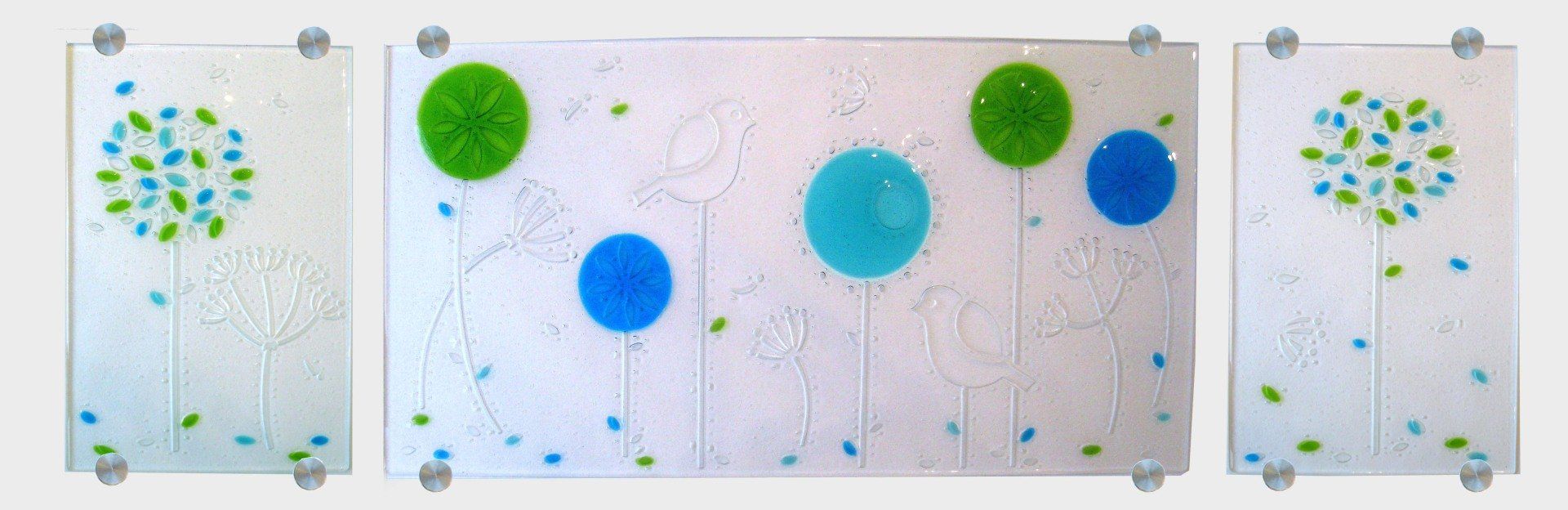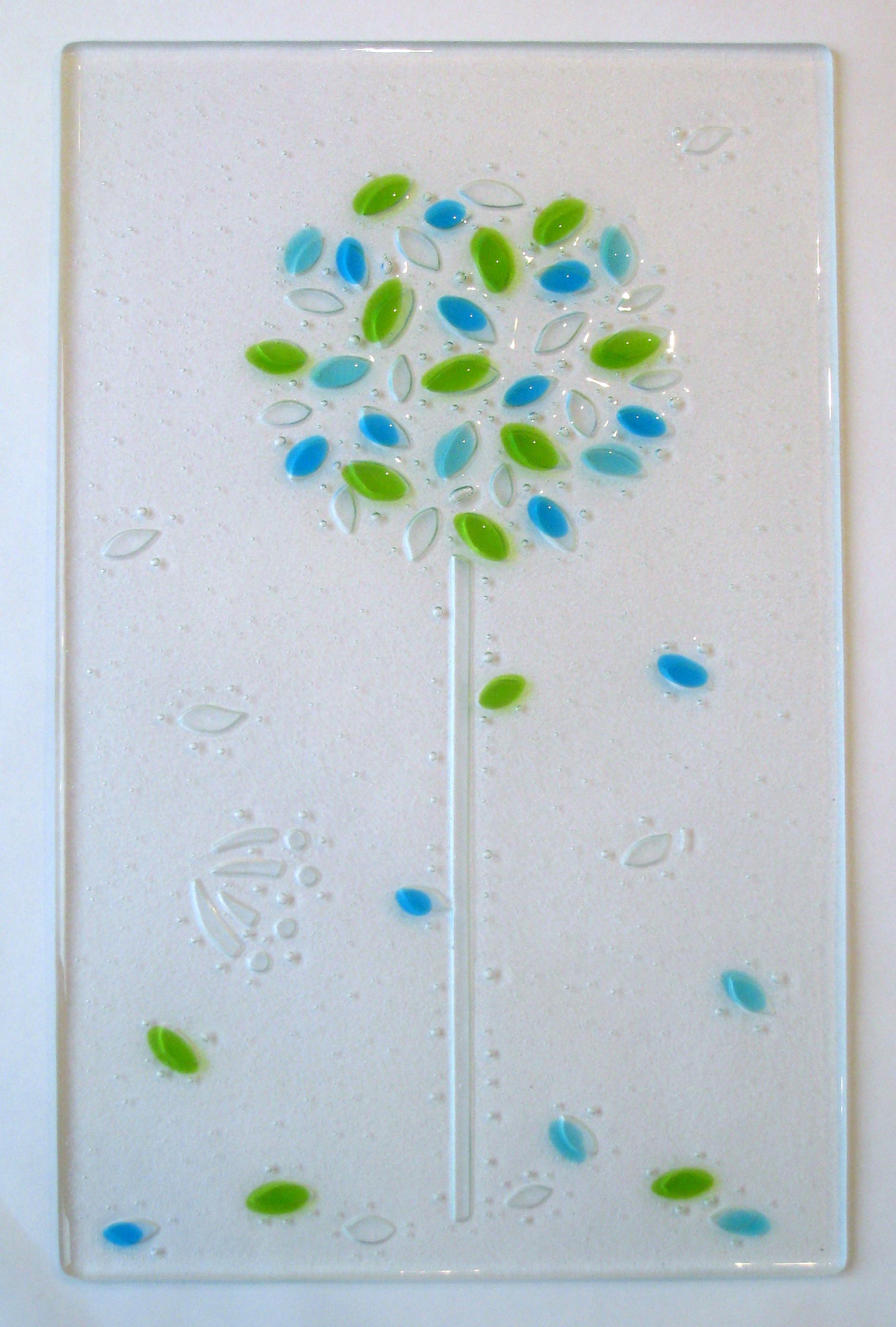 Fused or kilnformed glass is created by cutting pieces of glass and melting them in the kiln often with the addition of smaller glass elements to add finer detail. It generally has a more contemporary look than traditional leaded stained glass which makes it perfect for wall mounted artworks.